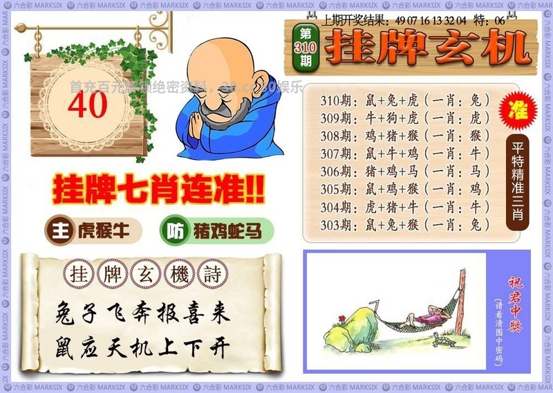 | 310期七肖 | 虎蛇鸡兔龙猪羊 | 开:虎16 |