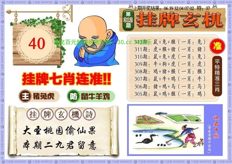 | 300期七肖 | 鼠龙鸡虎马羊狗 | 开:虎40 |